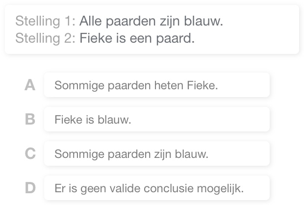 Een syllogisme is een klassieke vorm van redeneren en bestaat uit twee stellingen die tezamen tot een valide conclusie kunnen leiden. Het is jouw taak om te onderzoeken of er een valide conclusie kan worden getrokken op basis van de twee stellingen. Hieronder staat een voorbeeld van een syllogisme vraag: